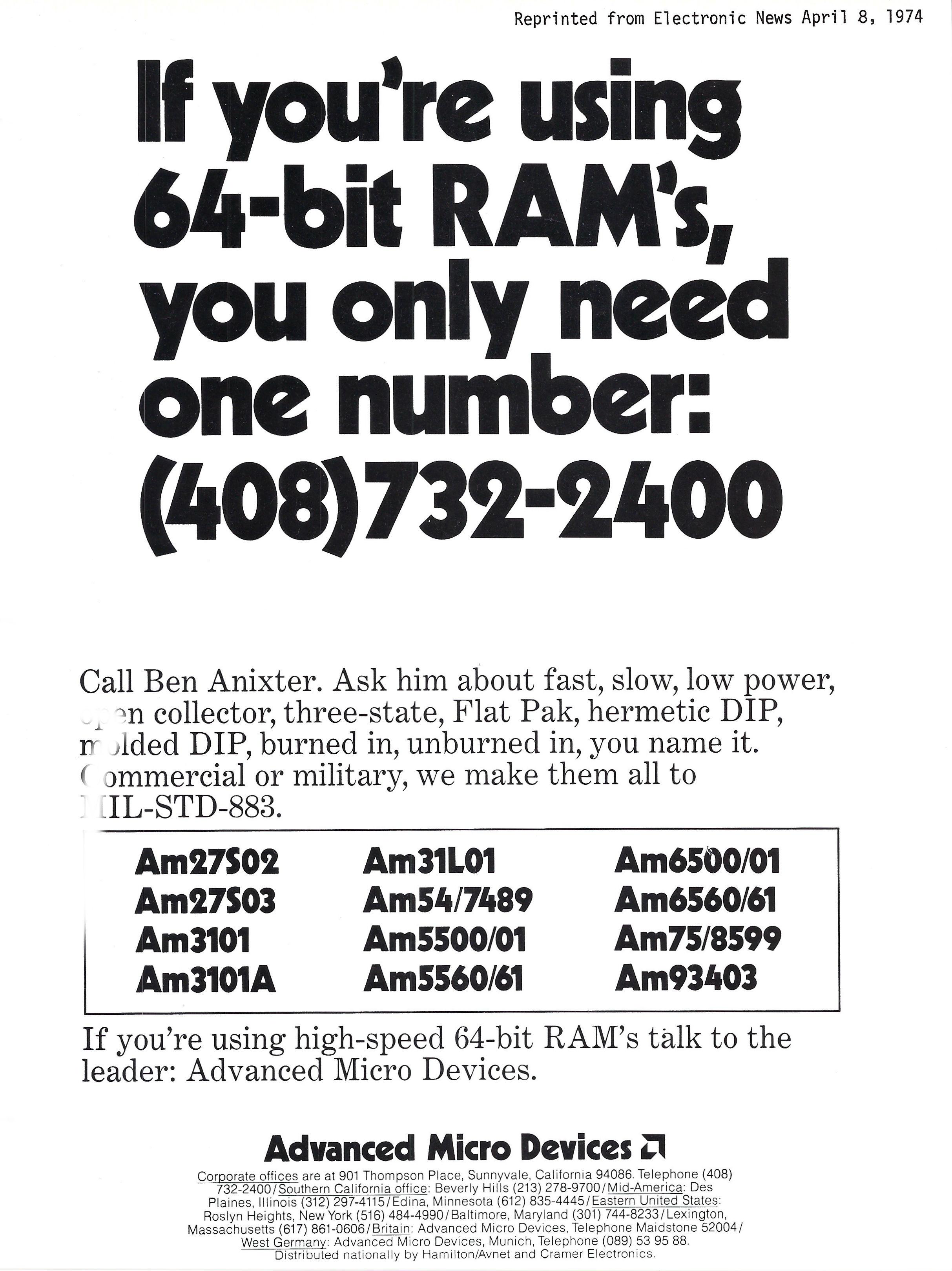 AMD-3_64-bit-ad The 64-bit RAM was a popular circuit offered by Intel, Fairchild, Texas Instruments (TI), and others but often in short supply. AMD capitalized on this with one of its earliest memory offerings.