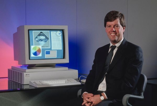 Sun Microsystems cofounder Scott McNealy poses next to a Sun workstation. Started in 1982 out of a project at Stanford University, the company’s first product was based on the Stanford University Network (SUN) workstation designed by student Andreas Bechtolsheim.
